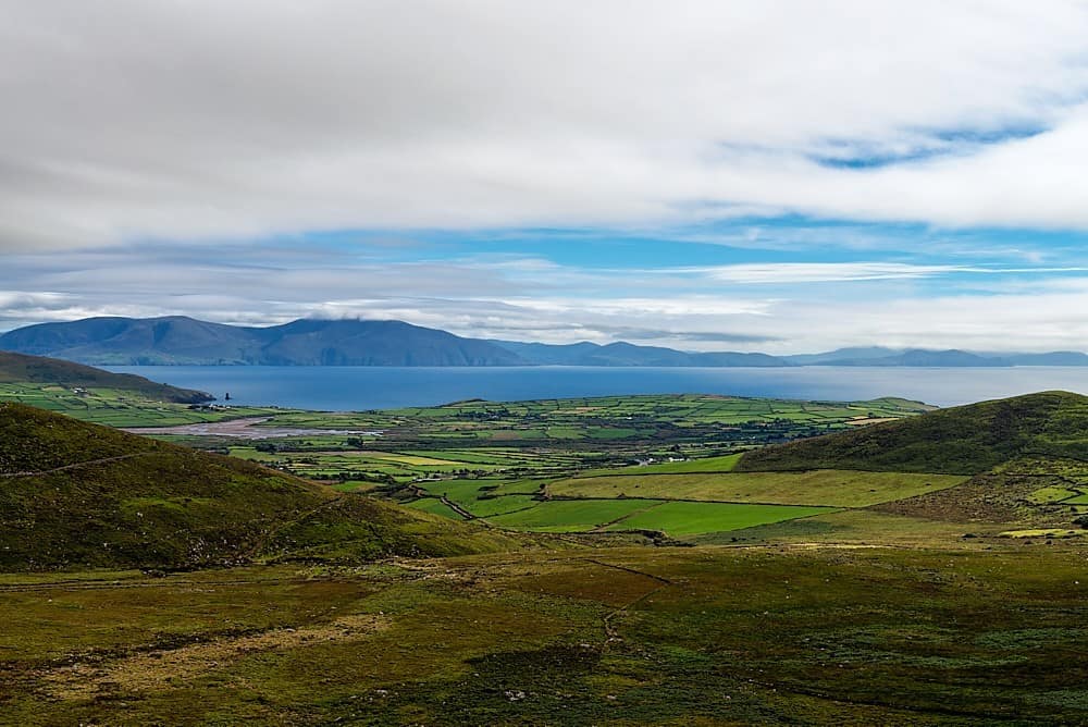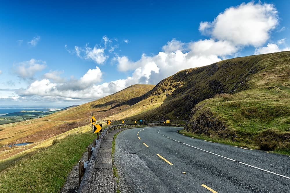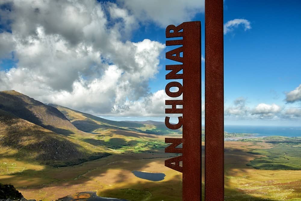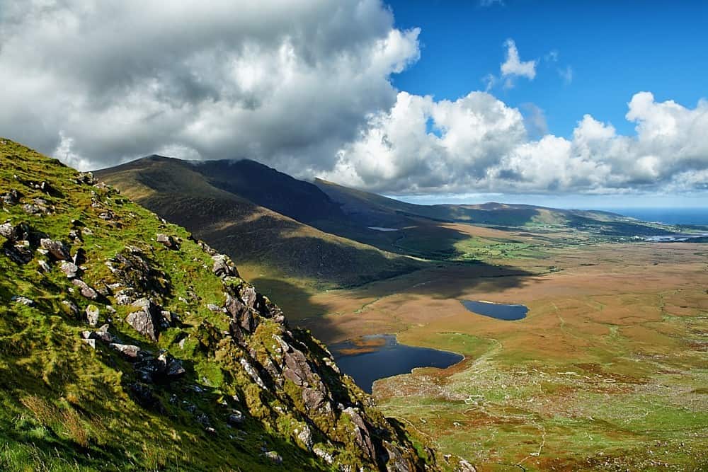 Der Conor Pass ist mit einer Höhe von 456 Metern Irlands höchste Passstraße. Vom Parkplatz auf der Passhöhe hat man einen traumhaft schönen Blick Richtung Mount Brandon und die Brandon Bay. Die Seen unten im Tal sind Überbleibsel der letzten Eiszeit – sogenannte Toteislöcher.