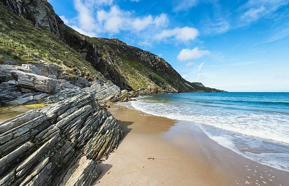 Der traumhaft schöne Maghera Strand liegt am Fuß hoher Berge. Am Westende des Strands befinden sich Höhlen, die nur bei Ebbe erreichbar sind.